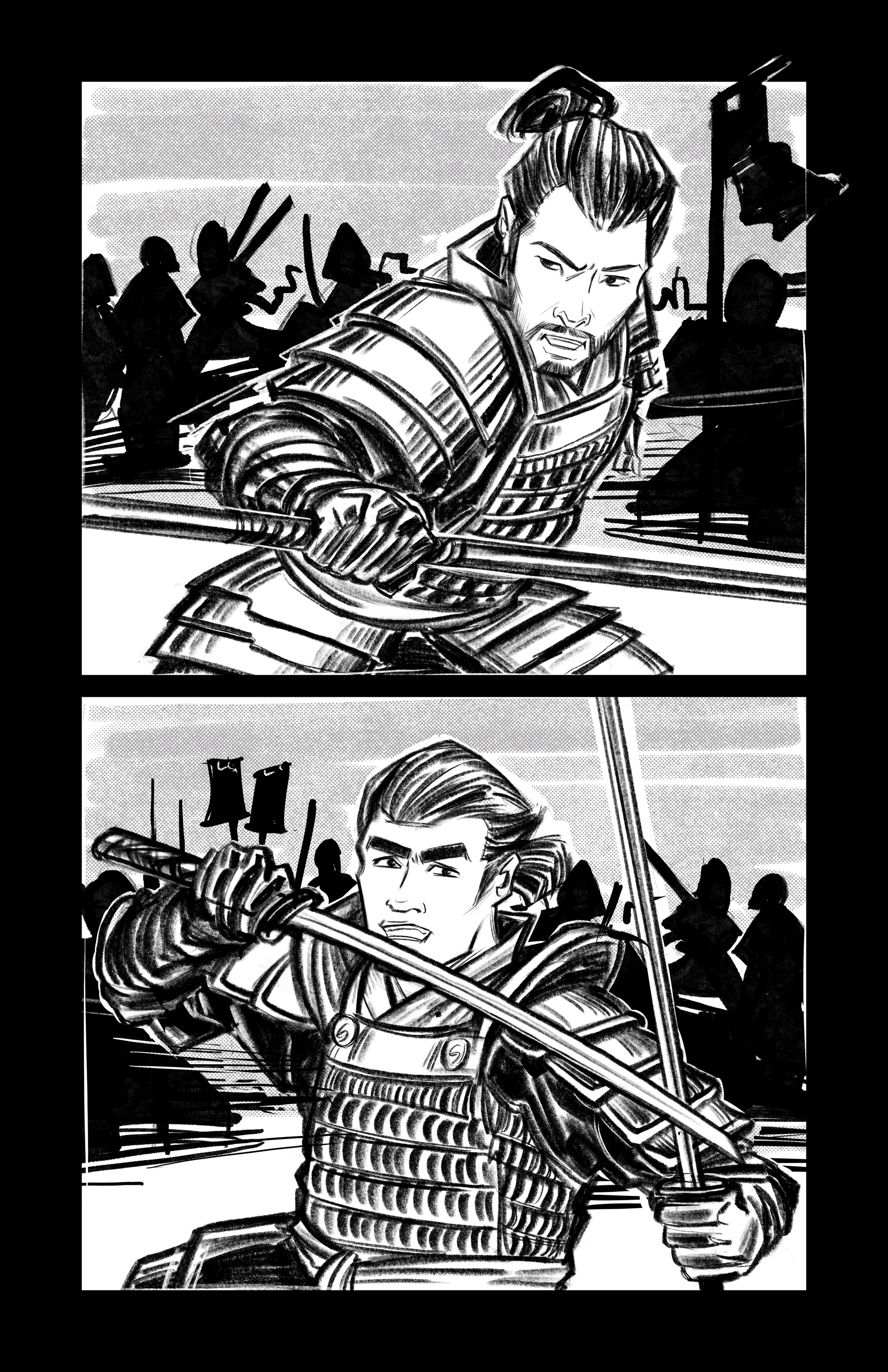 - Striking black and white illustrations with dramatic lighting and expressive action
